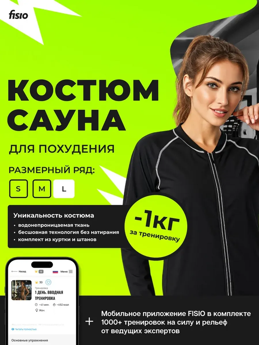 Эффект сауны без похода в баню Уникальный состав костюма усиливает процесс потоотделения. Костюм-сауна усиливает потоотделение, помогая телу избавиться от лишней жидкости, токсинов и отечности. Даже при умеренной активности вы почувствуете результат! Термо костюм препятствует доступу воздуха снаружи и сохраняет тепло внутри. Вы можете проводить в спортивном костюме кратковременные интенсивные тренировки, либо ходить в нем по улице — эффект похудения будет в любом случае. Спортивная форма с термо эффектом дает быстрые результаты.