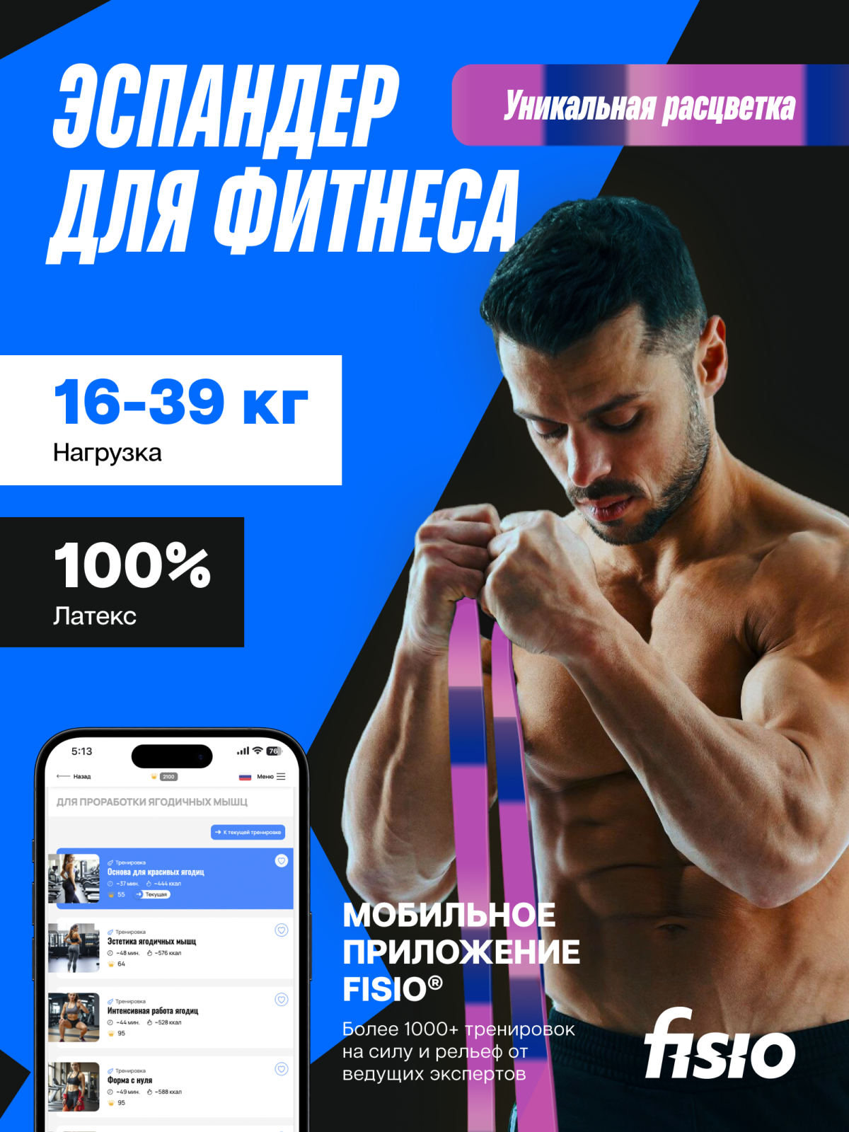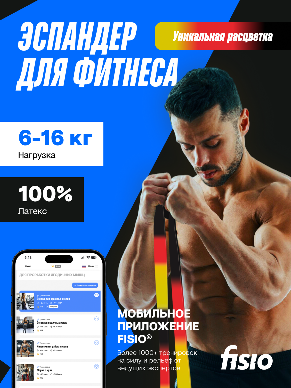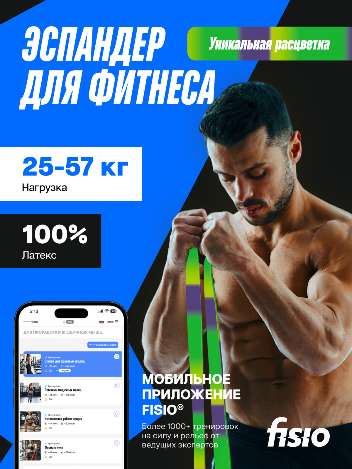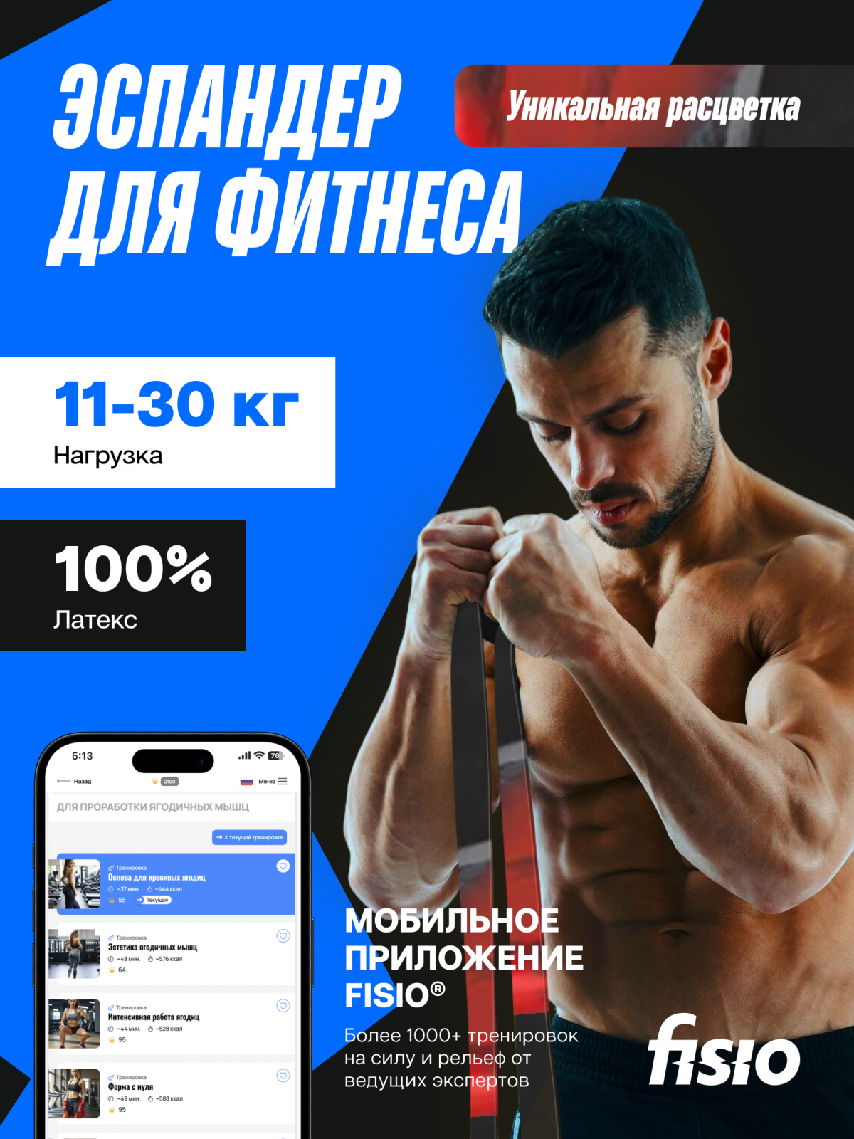 В комплекте мобильное приложение FISIO c доступом на 1 месяц с готовыми тренировками на фитнес-резинках!